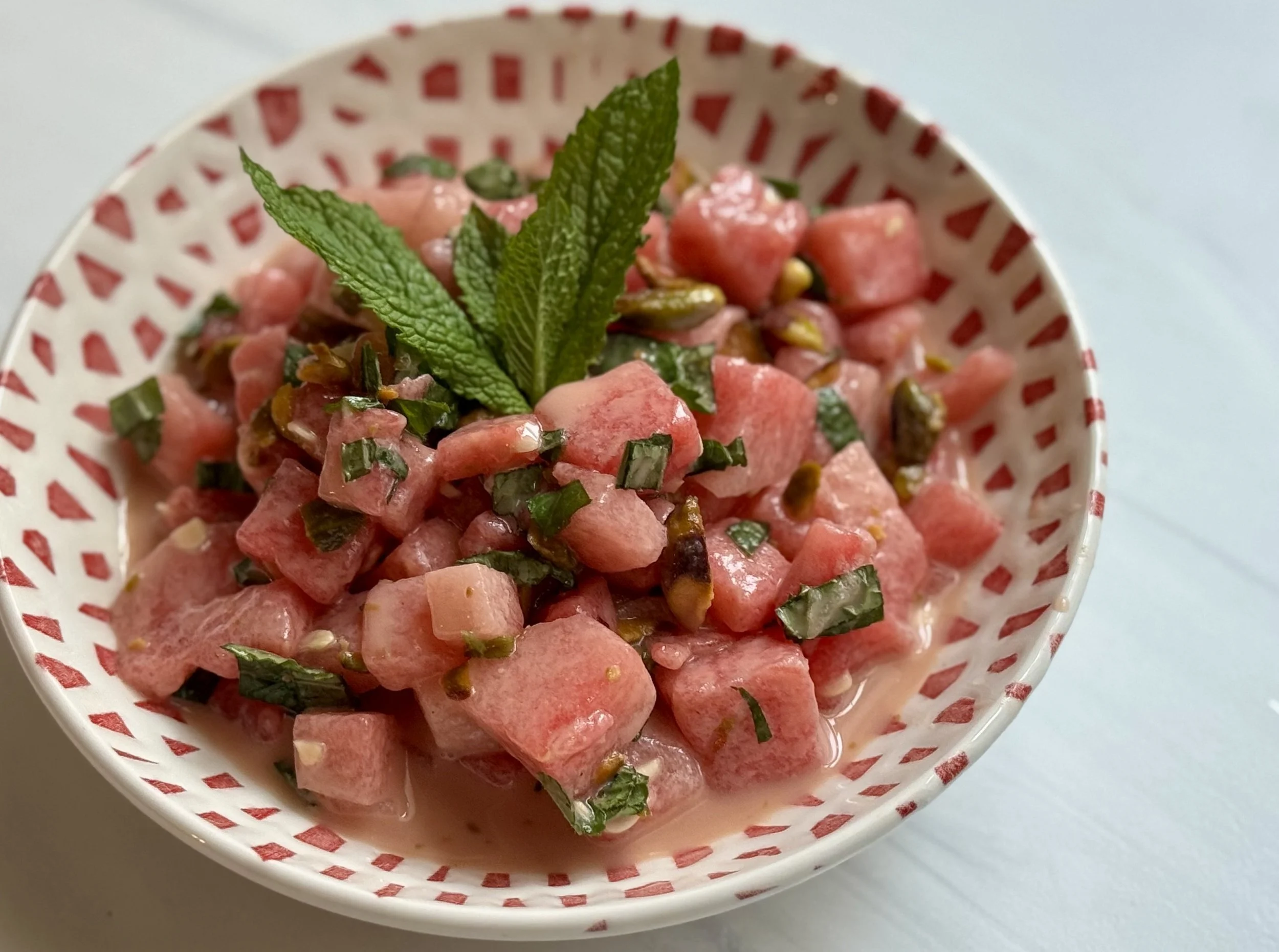 Start by carefully dicing your watermelon into ½” cubes. Place them in a large bowl and add the pistachios and mint. Drizzle the tahini and honey all over the watermelon, and sprinkle the kosher salt. Alternatively, you can whisk the tahini, honey, and kosher salt in a separate container to find your preferred balance of sweetness and saltiness. Give everything a toss until the watermelon has a light pink hue. Chill in the fridge until it’s time to serve, as this is best ice cold.